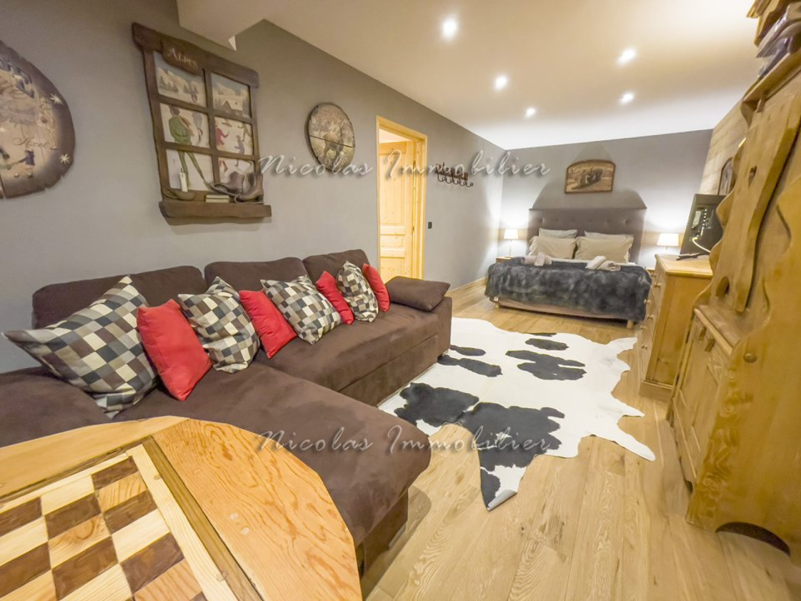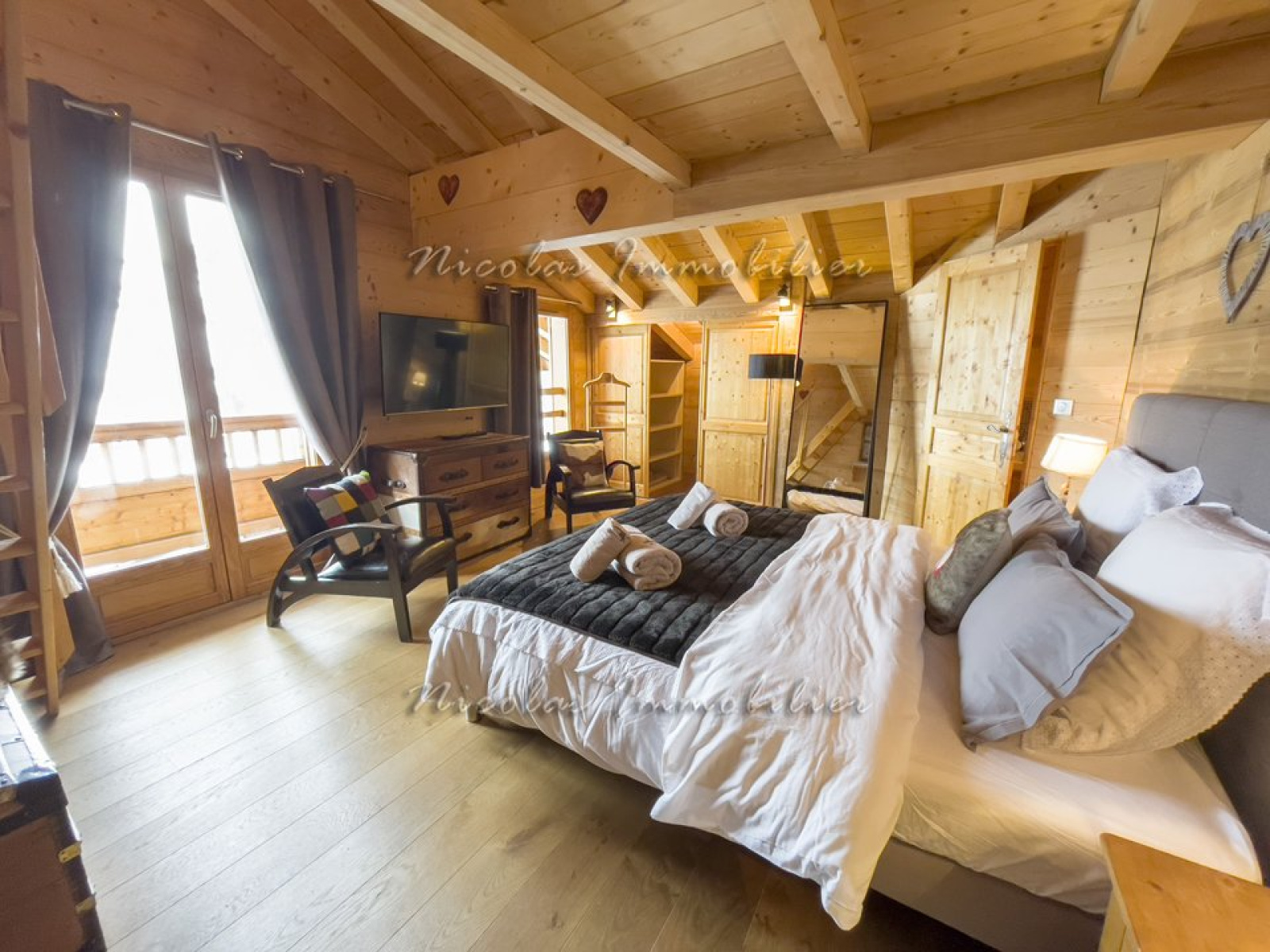Le chalet est composé d'une chambre avec un lit double, une salle de bain privative avec wc, de 2 chambres avec lit double, d'une chambre avec lit double et un canapé lit, d'une chambre avec salle d'eau avec douche, d'une salle de bain avec wc, et d'un wc séparé, d'un salon salle à manger avec cheminée et télévision, d'une cuisine entièrement équipée (réfrigérateur-congélateur, plaques de cuisson, four, micro onde, lave vaisselle), d'une buanderie avec lave-linge et sèche-linge et d'un garage.
